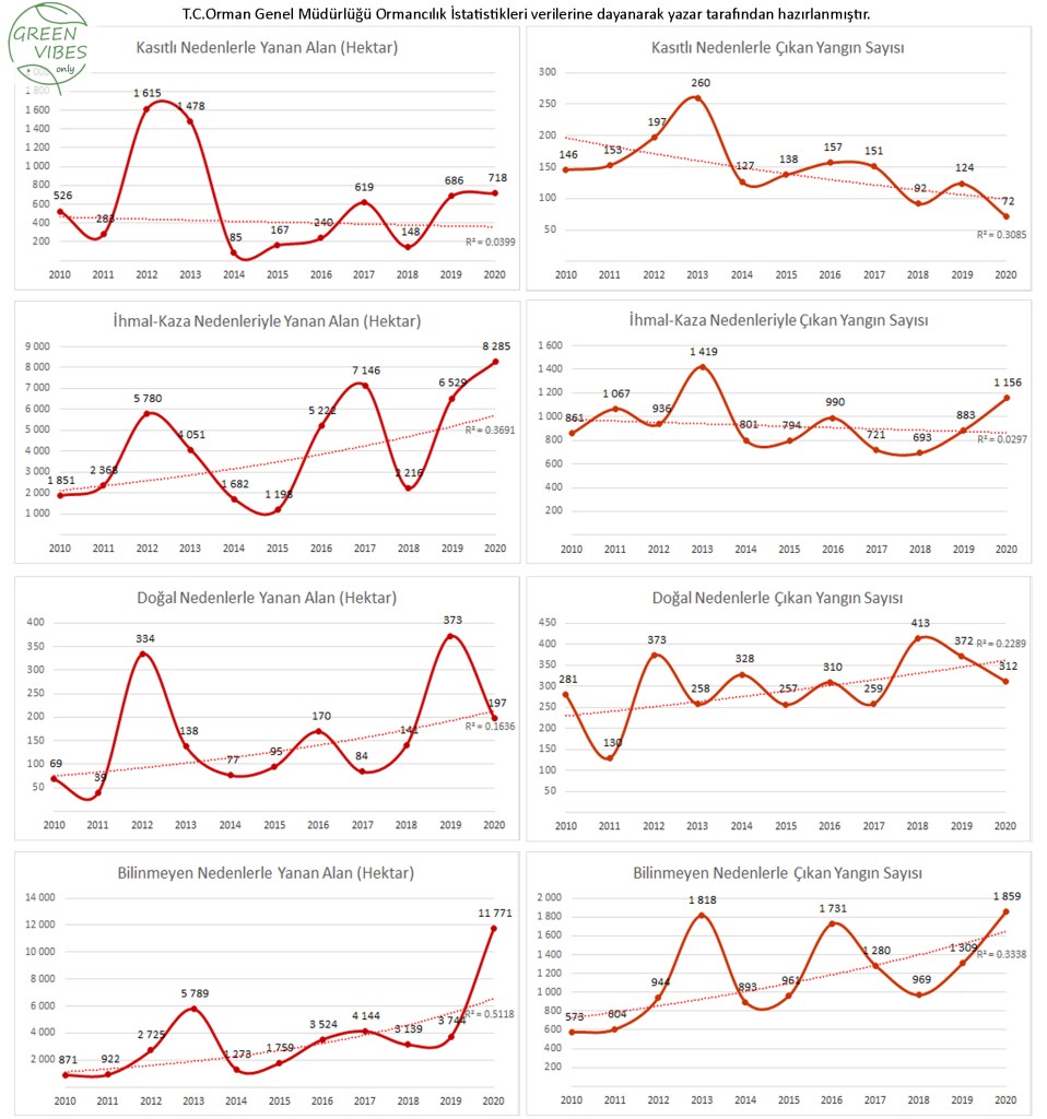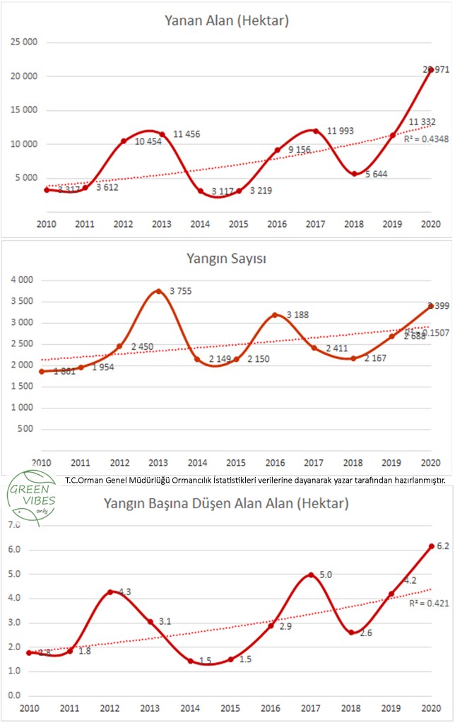 Geçtiğimiz 10 yılın yangınlarına baktığımızda son yıllarda yangın sayısında, yanan alan miktarında ve yangın başına düzen alan miktarında artış eğilimi olduğunu görebiliriz. Üstelik Nil’in yazısında söz ettiği gibi IPCC Raporu ve farklı bilimsel çalışmalarda iklim krizinin etkileri arttıkça yangın riskinin artacağı belirtiliyor. Son 10 yıldaki eğilim bu uyarının ciddiye alınması için kanıt niteliği taşıyor. 2021 yılında yangın sezonunun ortalarındayken çıkan 199 yangınla 220 bin hektarın üstünde alan yandı. Bu miktar 1988-2020 arasında yanan alanın %61’i kadar. Yani yalnızca bu sene, geçtiğimin 22 yılda yanan toplam alanın üçte biri kadar alan yandı.