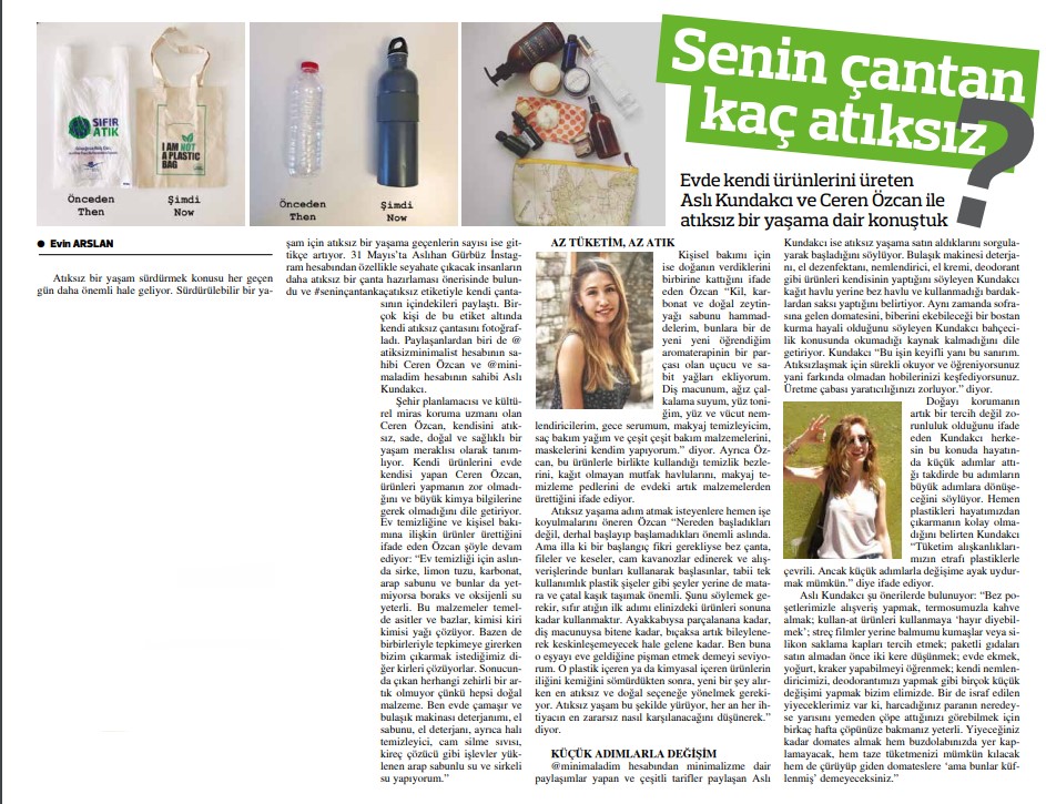 Oyuncu Aslıhan Gürbüz’ün pandemi başında sosyal medyada düzenlediği “Senin Çantan Kaç Atıksız?” hareketi sonrasında Gazete Kadıköy benimle ve sevgili arkadaşım Aslı Kundakcı ile atıksız yaşama dair röportaj yapmıştı. İnternet sitesinde de yer alan bu röportajı buraya da eklemek istedim. Keyifli okumalar!