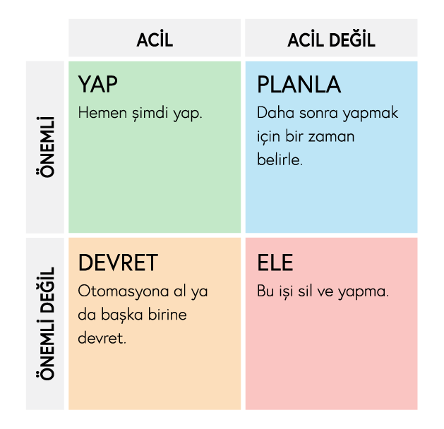 İşleri aciliyet ve öneme göre değerlendiren bu matrise yerleştirdiğinizde yap kısmı en önceliklisi, planla ise onun ardından geleni.
