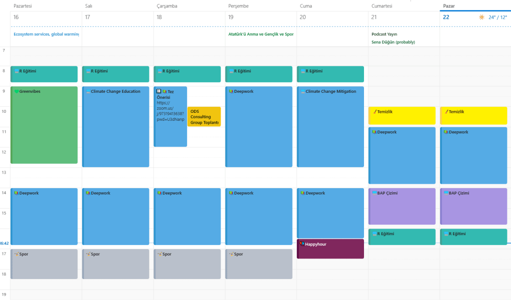 Bu benim en çok kullandığım yöntem (aşağıda bir görselini ekledim). Takviminizde belirli zaman aralıklarını belirli görevler için tamamen kapatıyorsunuz. Bir göreve zaman ayırmazsanız o işi yapmazsınız. Bu yaklaşımla her işe belirli bir zaman ayırmak gerekiyor. Bu kendinizi takip edip üzerinizdeki iş yükünü yönetmenizi sağlar. Savsaklamanıza da engel olur. Bunu dijital olarak da kağıt üzerinde de yapabilirsiniz.