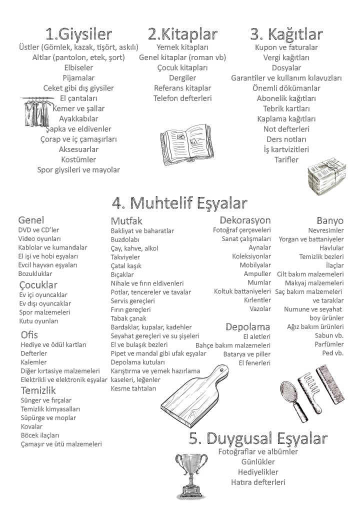 Bana göre evde sadeleşmek, sadeleşmenin ilk basamağı. Bana göre Konmari metodu ile evlerde sadeleşmek insana başka bir bakış açısı kazandırıyor. Önce Konmari metodunu açıklayayım (bu yazıda çok daha detaylı açıklıyorum). Bu metot Marie Kondo tarafından geliştirilip yaygınlaştırılmış bir metot. Eşyaları size hissettirdiklerine göre ayıklamayı öneriyor temelde. Genel olarak bir eşyayı elinize alıyor, içinizde bir heyecan/neşe uyandırıyor mu (sparking joy) bakıyor, uyandırmıyorsa vedalaşıyorsunuz. Tabii ki buna ders kitapları, belirli evraklar gibi şeyler dahil değil. Genelde ayıklamaya giysilerden başlamayı, ardından kitaplar, kağıtlar, muhtelif eşyalar (önceki kategoride ve duygusal değer taşımayan tüm eşyalar), ve en son duygusal eşyaların ayıklanmasını öneriyor. Duygusal şeyleri en sona bırakma sebebimiz sadeleşme kasımızın o kısma kadar gelişmesi için zaman kazanmamız. Bir sıralamaya ihtiyaç duyuyorsanız, kitabımda yer alan şu sıralamayı kullanabilirsiniz: