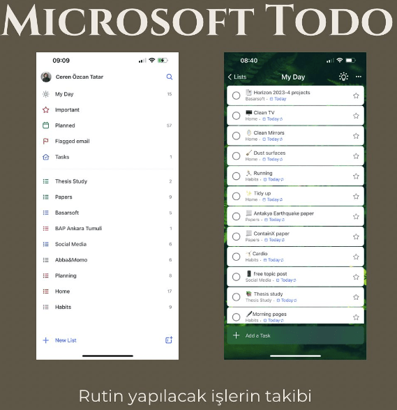 Bir plancı deyimiyle “üst ölçekli planlarımda” belirlediğim günlük eylemleri, özellikle de rutin niteliğe sahip olanlar mutlaka Microsoft Todo uygulamasına ekliyorum. Sabah ve akşam rutinlerim, haftalık temizlik rutinlerim, spor programlarım, haftalık iş ve akademik çalışma planlarım, kedilerimin aşıları, planlama için önemli olan ay sonu yıl başı gibi zamanlar için kurduğum hatırlatıcıları ekliyorum. her gün “Günüm” görünümünde önceden hazırlanmış olan hatırlatıcılarım günlük bir liste olarak önüme diziliyor. Yapıp tik attıkça daha da motive oluyorum.