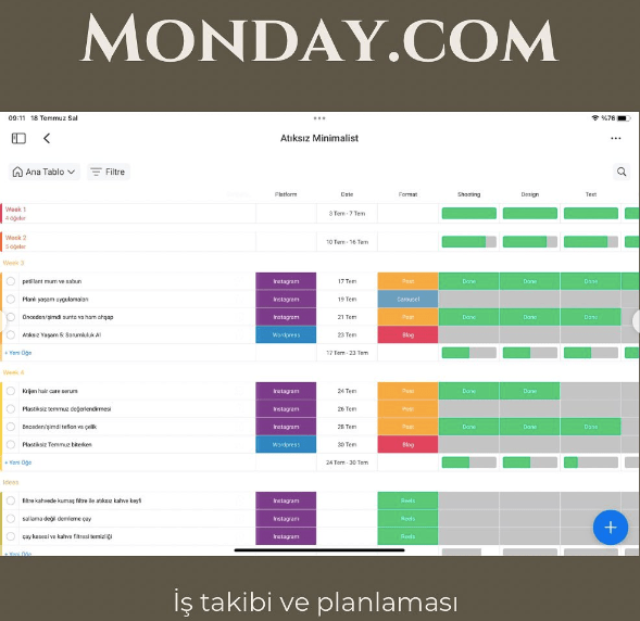 Monday.com bence harika bir uygulama. Todo’dan farklı yanları olduğu için tercih ettiğim bir uygulama kendisi. İş, makale çalışmalar, tez çalışmaları ve atıksız minimalist için haftalık yapılacakları tüm detaylarıyla, ilişkili işler ve kişilerle bağlantılı şekilde not alıyorum. sürükle bırak mantığıyla çalışabildiği için de kolaylık sağlıyor. Monday.com’u anlatmak biraz zor. Denemeniz lazım. PC ve Mac’te premium üyeliğe yönlendiriyor bazı özellikler için ancak mobil cihazlarda o özellikleri de ücretsiz kullanabiliyorsunuz.