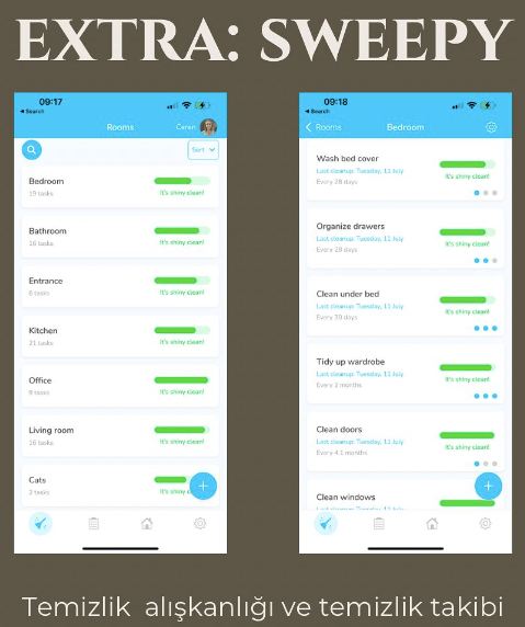 Bu uygulama ev temizliğine yönelik. Odalar oluşturup o odalardaki temizlik işlerini giriyorsunuz. O işlerin hangi sıklıkta yenileneceği, zorluk derecesi gibi bilgileri de ekliyorsunuz. Sonra o işi yapınca (mesela perde yıkama) hop yeşil oluyor. Bir odada ne kadar iş yapmışsanız o oda o kadar yeşil oluyor. Temizliği ihmal edilen odalar önce sarıi sonra da kırmızıya dönüyor. Ben temizlik konusunda çok müşkülpesent biriydim, bu uygulama evimin beni zihinsel ve fiziksel olarak yormayacak şekilde temiz olmasını sağladı. Çünde günde 3 iş öneriyor size, onları yapmanızla hop yeşile dönüyor. Takıntısız temizlik için ideal bir uygulama :).