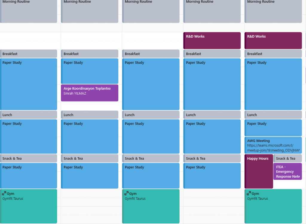 - Aylık planımı yaparken zaman pencerelememi yapıyorum. Yemek, toplantılar, spor ve kişisel zamandan arta kalan kısımları iş ve okul için pencereliyorum. Pencerelerken özellikle yatay rutinler oluşturmaya özen gösteriyorum (aşağıya ekran görüntüsünü koydum). Dikey rutinlerim de genelde aylık olarak belirleniyor. Mesela pazartesileri tamamen tezime ayırdığım günler. Salı çarşamba toplantılarım haricinde akademik yayınlara ayırdığım dilimler. Perşembe ve cuma ofiste olduğum için ofise yönelik çalışmaları yaptığım günler oluyor.
